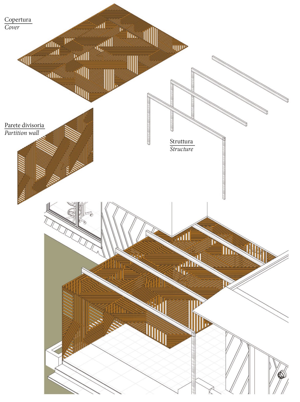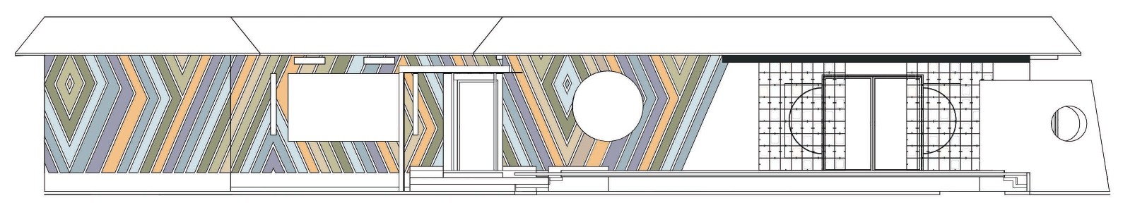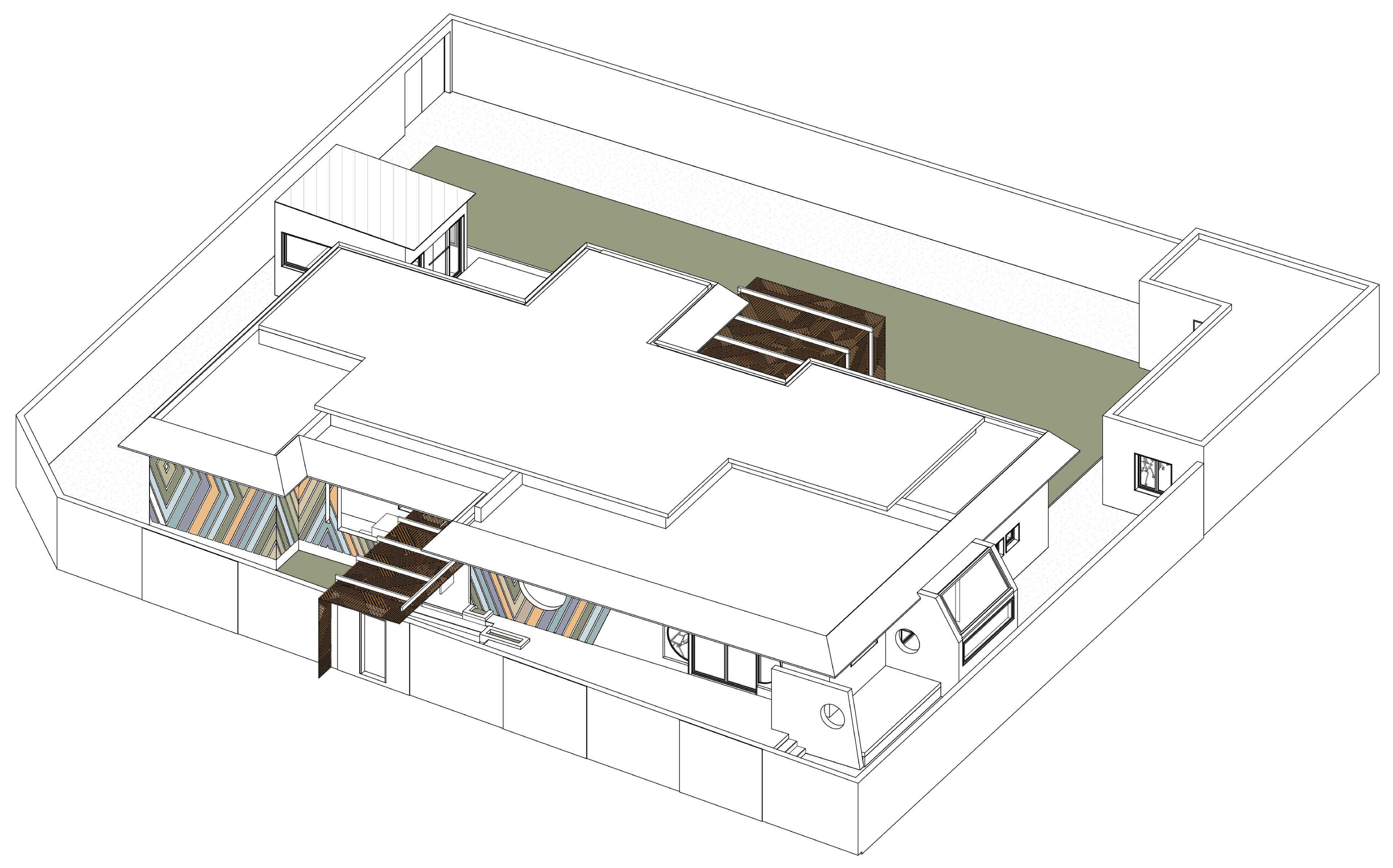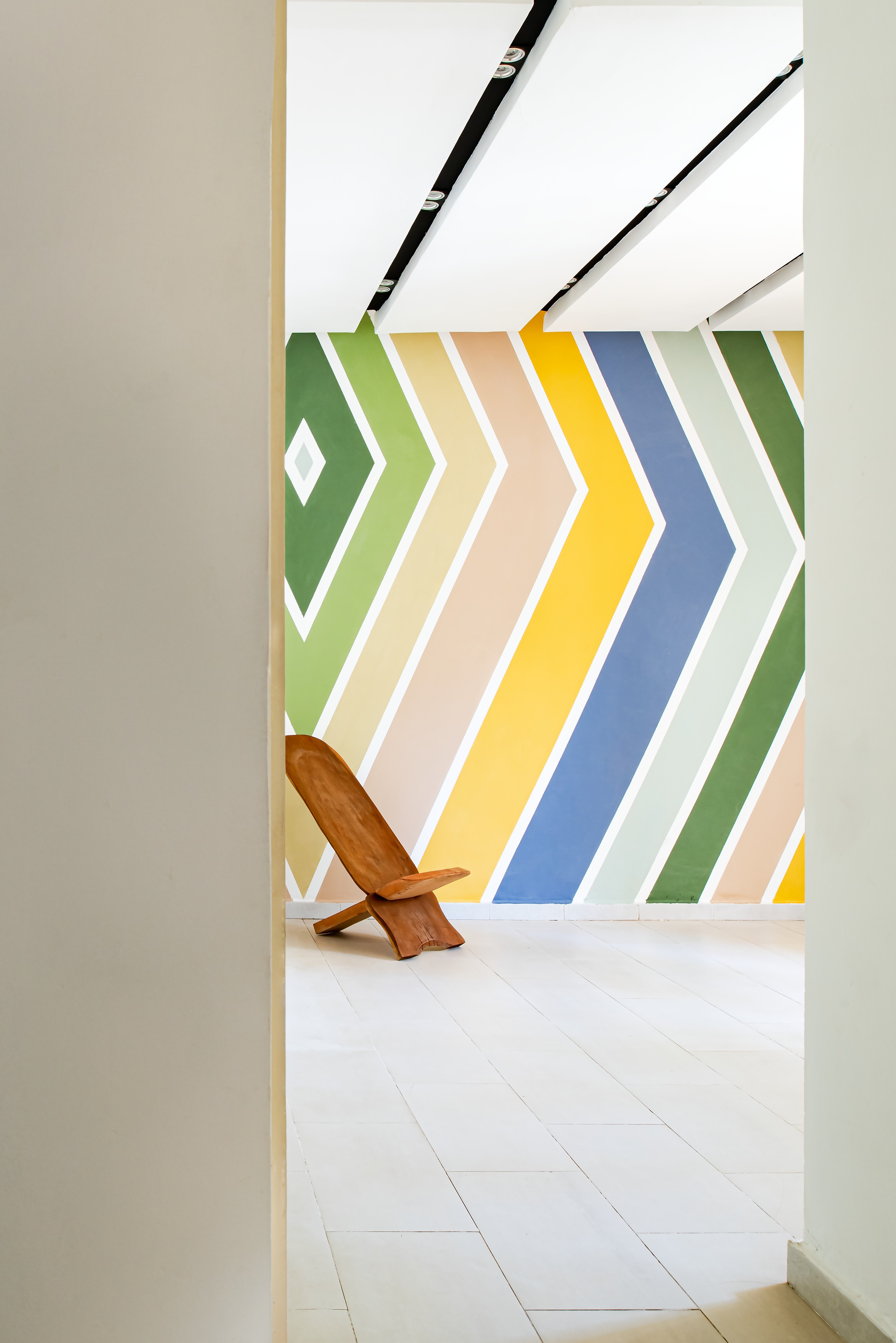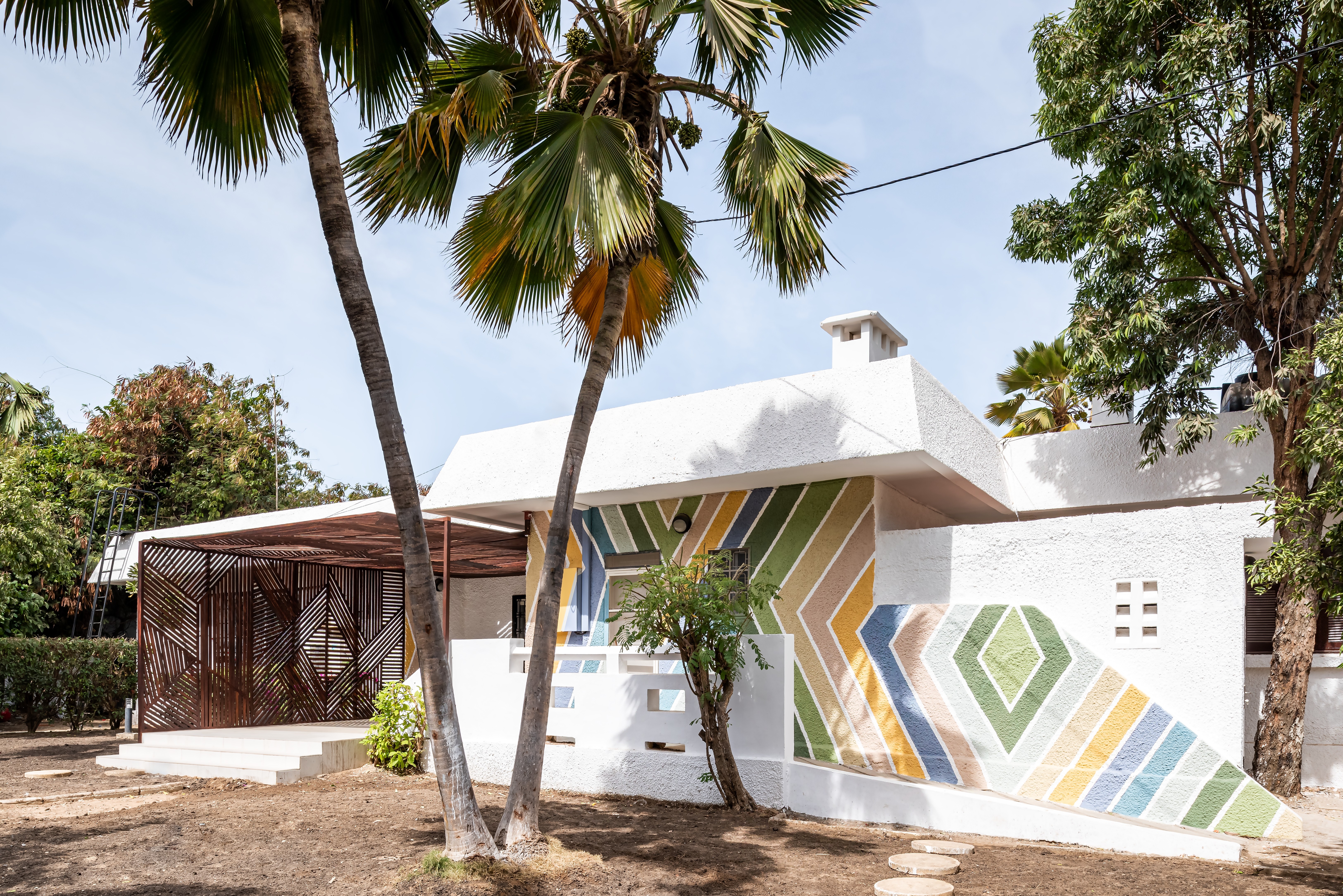 Let’s “dwell“ two distant cultures in a space. Like a new family, a new home in which everything must “live“. Here is the meaning of “dwell“ : to coexist, to accept that a part of Senegal is affected by Italy and a part of Italy is affected by Senegal. The interiors of the villa are adapted to the new use with bathrooms, meeting rooms and offices. The facades are a texture woven by the zigzags of Missoni fashion house and the typical colors of Senegal clothes. The hand-drawn rhombus with pencil and scotch is a clear memory to that handicraft of Italian and Senegalese tailors. The entrance and garden porch, typical example of Italian architecture, is inhabited by local geometric shapes. The wood used in an artisanal way, each piece is unique and nailed to the structure seamlessly, it is a tribute to the resourcefulness of the hand compared to technology. The colors come out to invade the neighborhood showing the “true” culture of the institute: to dwell!