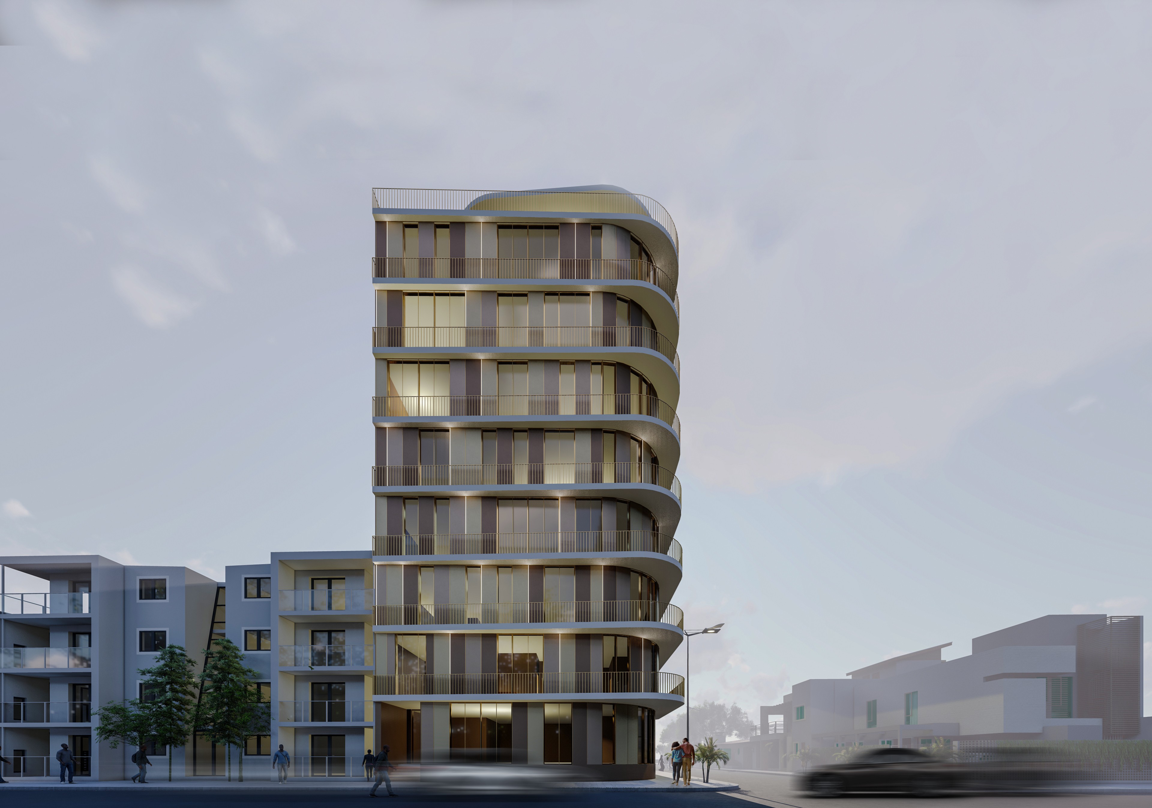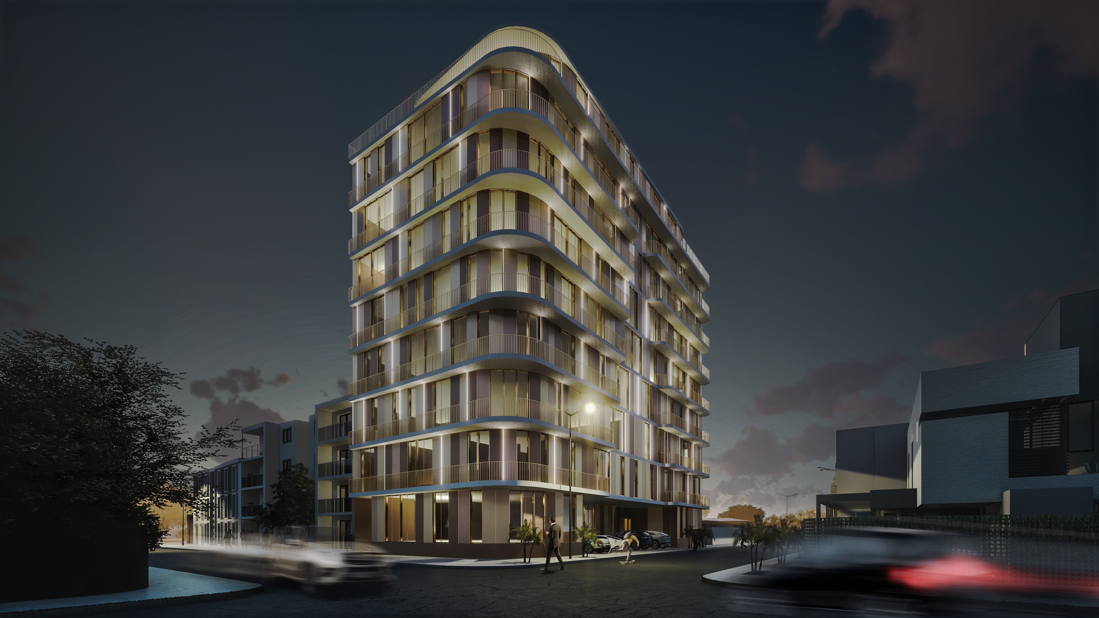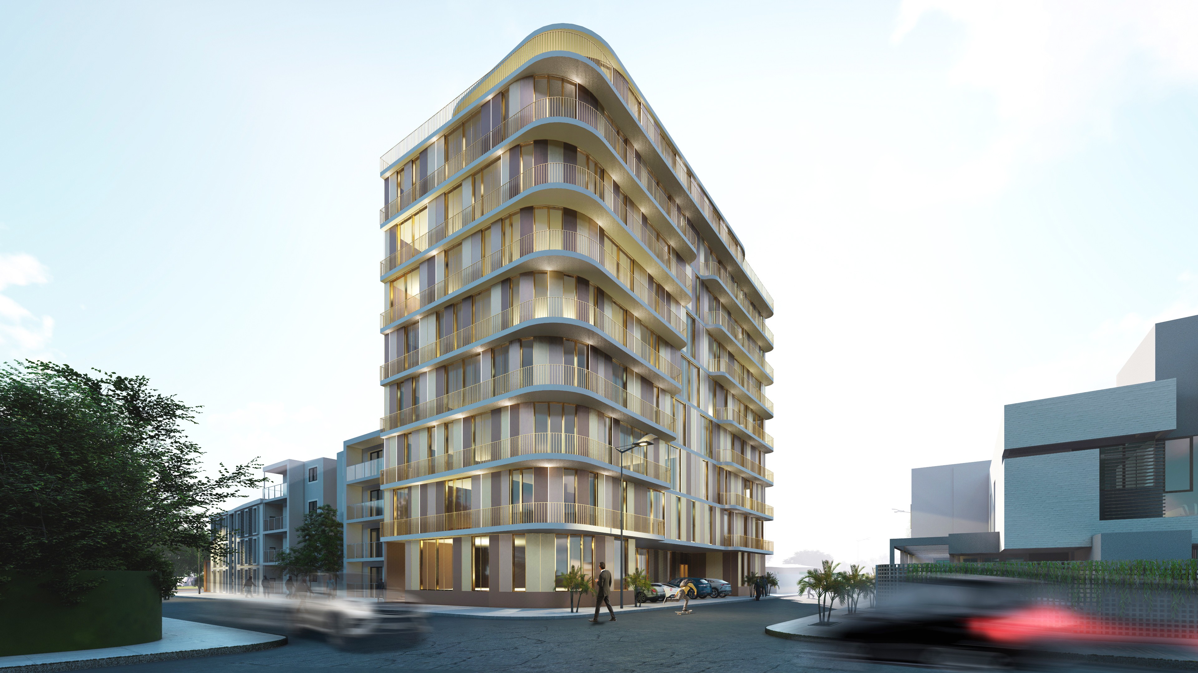 The massing of Residence Vittoria is shaped by both context and comfort. First, the sharp urban intersection is softened with a rounded corner to create a fluid street presence. The envelope is then wrapped in deep, continuous balconies. These undulating overhangs not only define the tower’s signature aesthetic but also maximize private outdoor space, provide crucial solar shading, and shield the apartments from the street