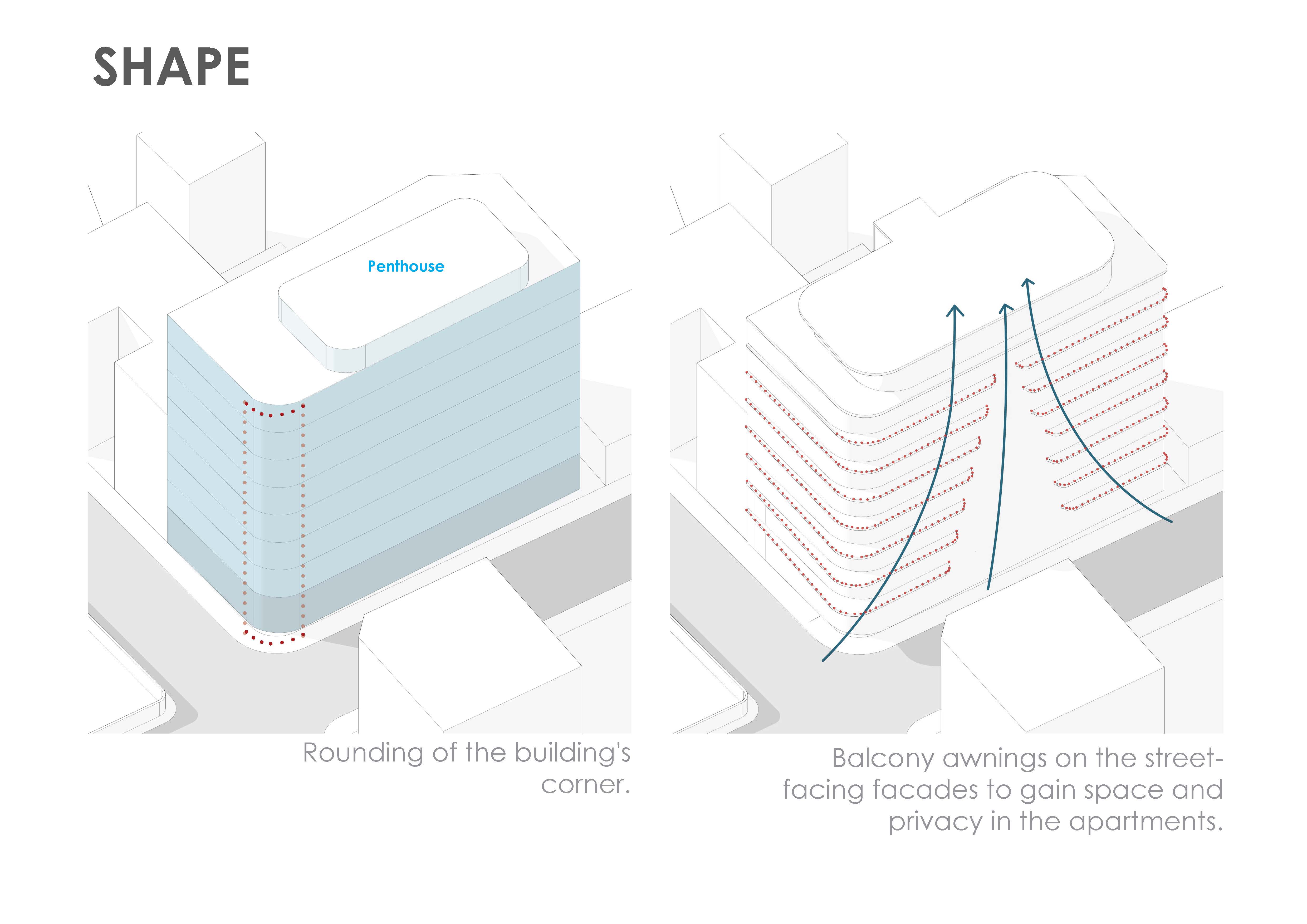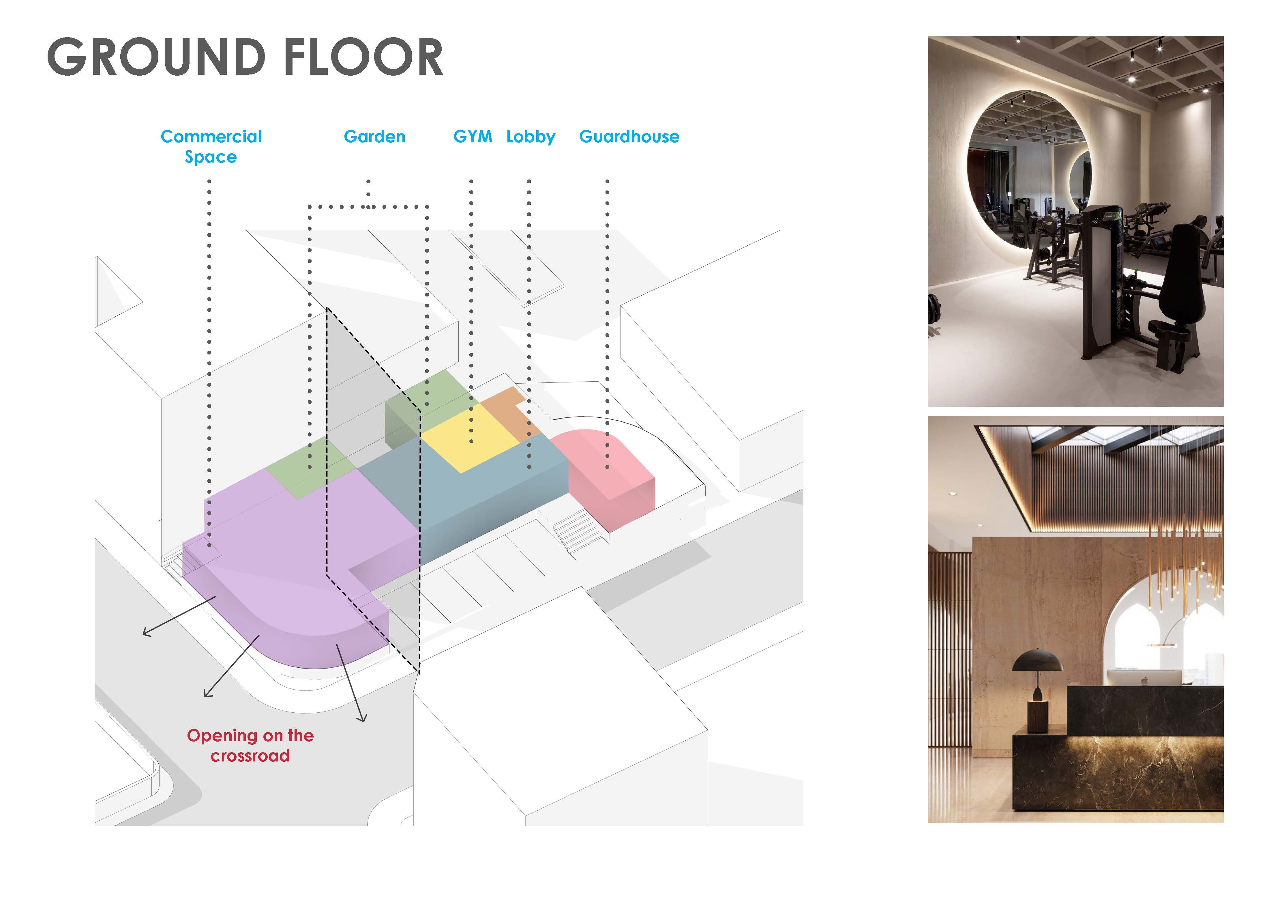 The ground floor footprint is strictly zoned to separate public commerce from private residential amenities: The Public Edge (Commercial): Wrapping the rounded street corner to maximize retail visibility and urban engagement. The Private Core (Lobby & Guardhouse): A secure, controlled entry sequence, ensuring absolute privacy for residents. The Wellness Zone (Gym & Garden): Tucked away from the street, offering residents an exclusive, light-filled fitness facility connected to a secluded green space