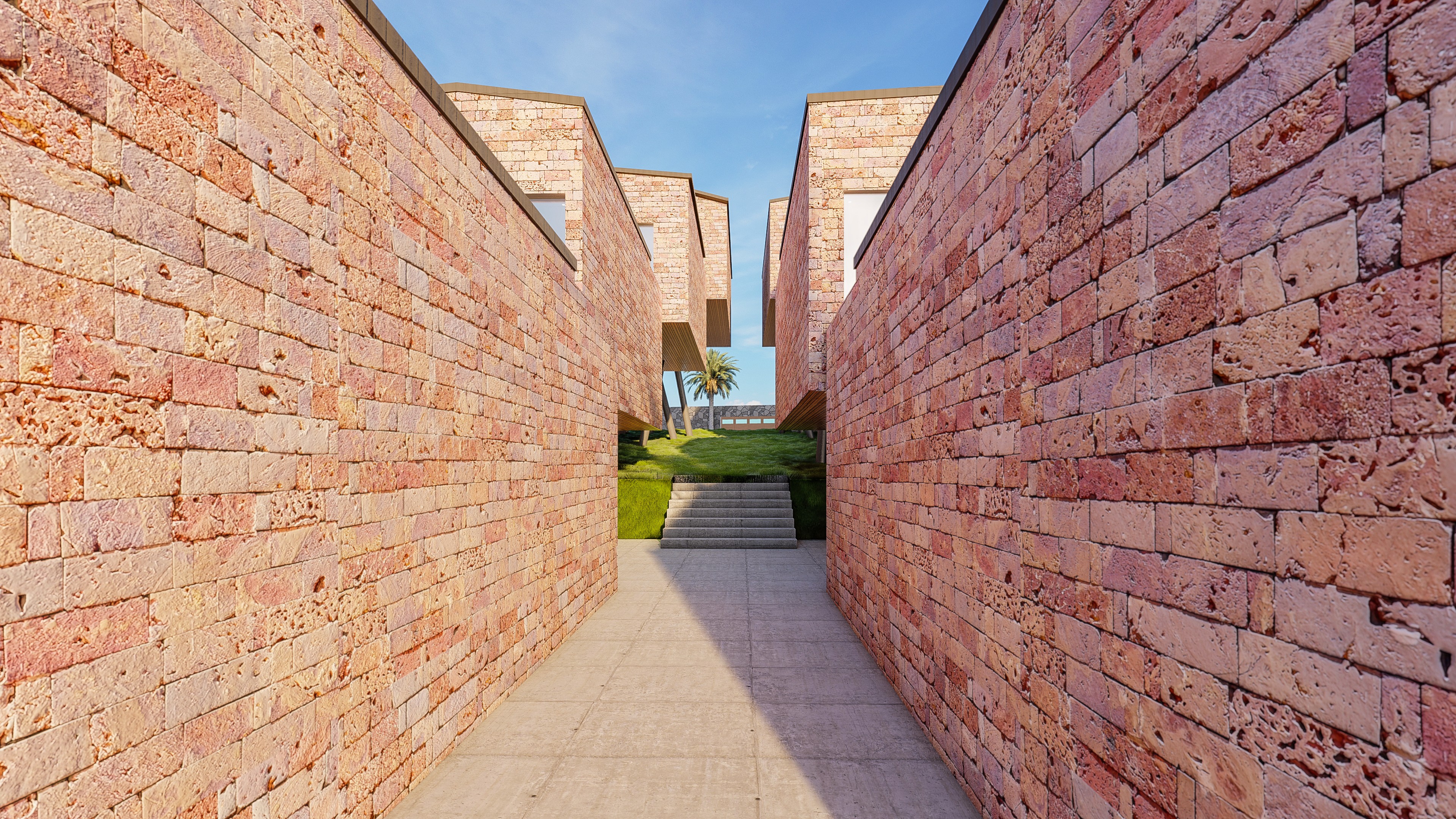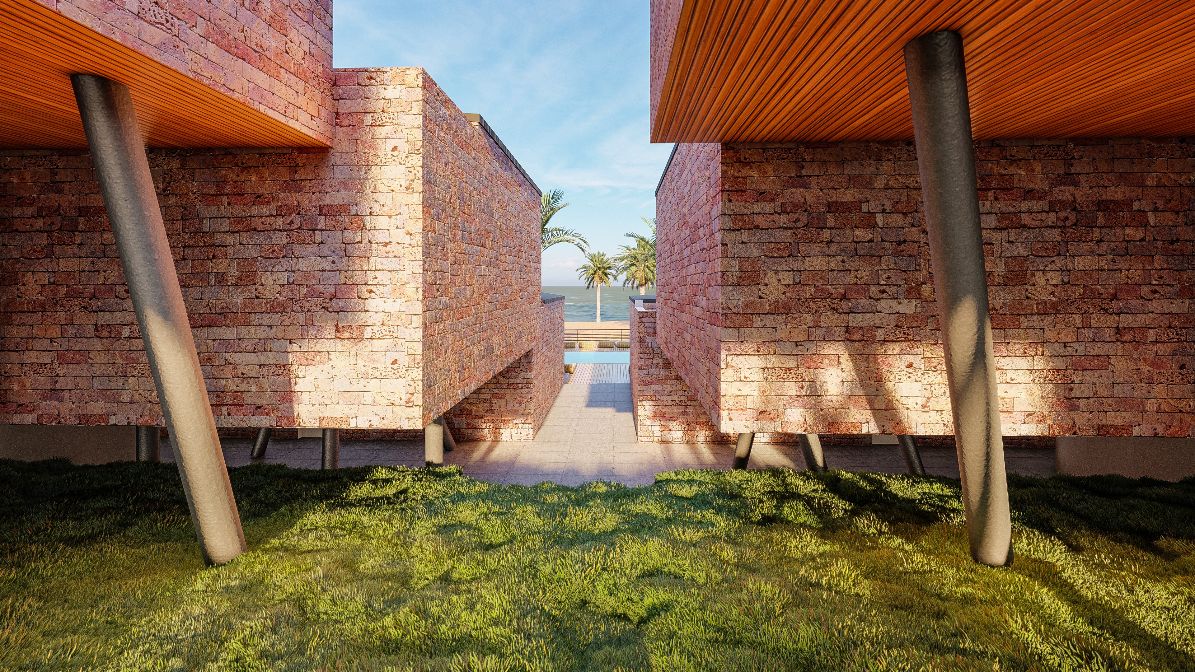 To prevent these massive volumes from overpowering the landscape, they are dramatically elevated on a network of slender, angled pilotis (columns) and solid cylindrical cores. This structural elevation allows the upper stone masses to seemingly "float," freeing up the ground plane to create shaded, open-air breezeways that invite the ocean wind deep into the site.
