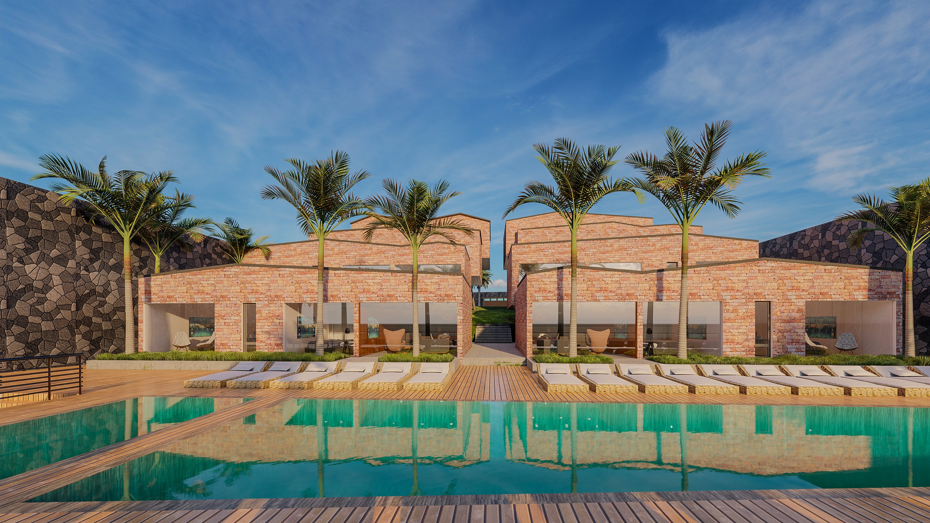 The architectural language of the resort is defined by a striking interplay of mass and permeability. The primary residential blocks are conceived as heavy, geometric monoliths with subtly faceted rooflines.