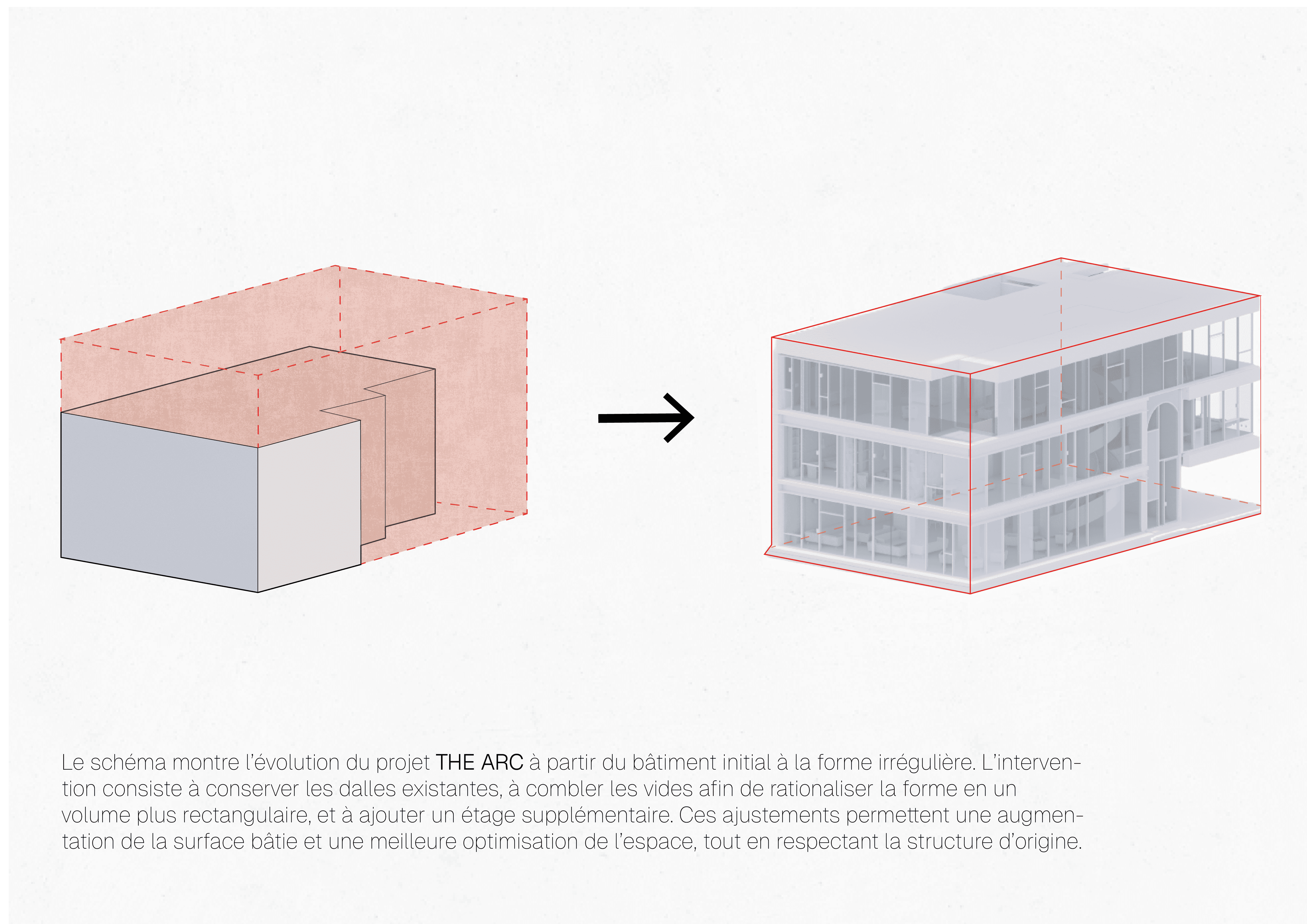 The diagram illustrates the evolution of THE ARC project from the initial irregularly shaped building. The intervention involves retaining the existing slabs, filling the voids to streamline the form into a more rectangular volume, and adding an extra floor. These adjustments allow for an increase in the built area and better optimization of space, while respecting the original structure.