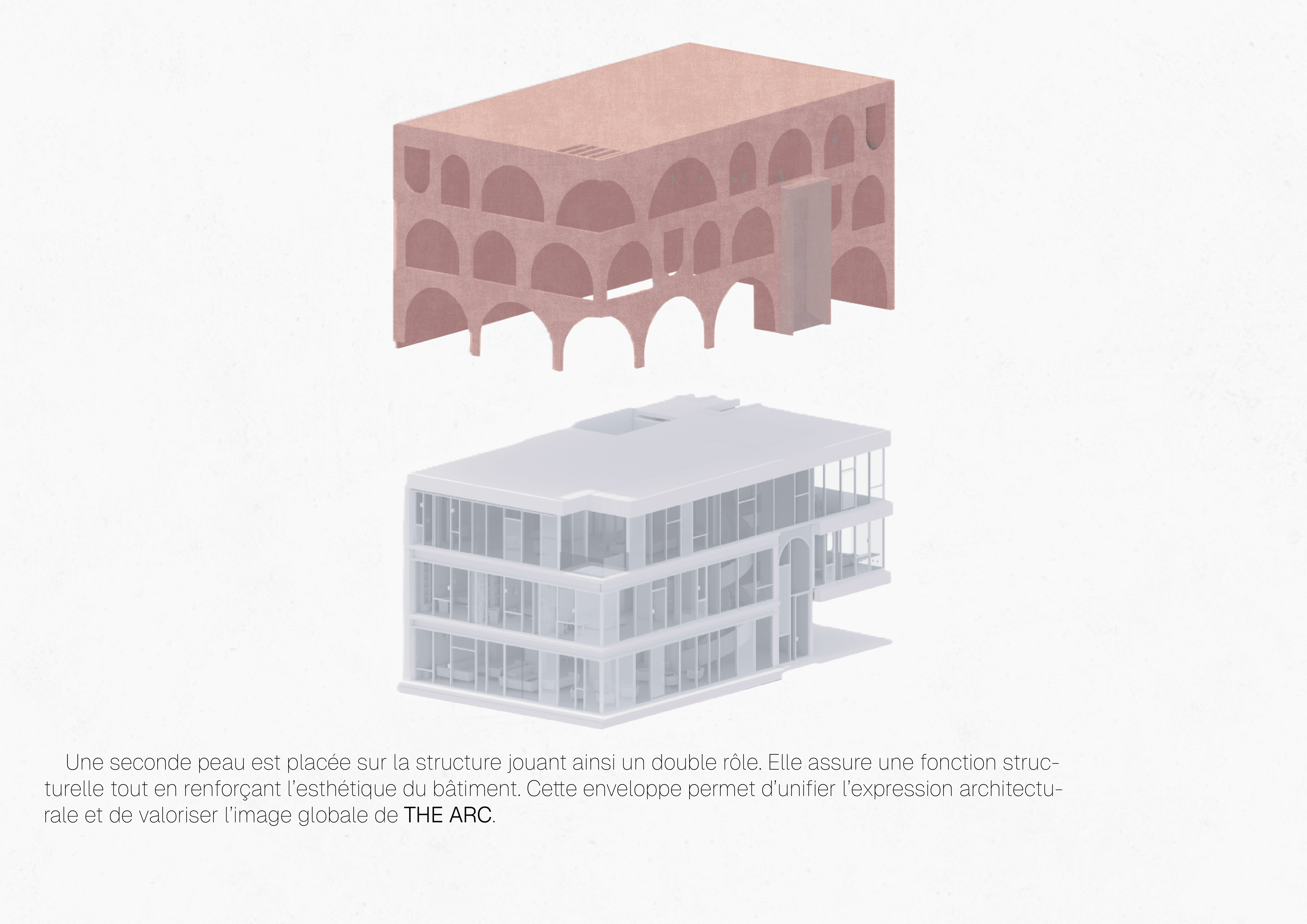 A second skin is placed over the structure, thus playing a dual role. It provides a structural function while enhancing the building's aesthetics. This envelope unifies the architectural expression and enhances the overall image of THE ARC.