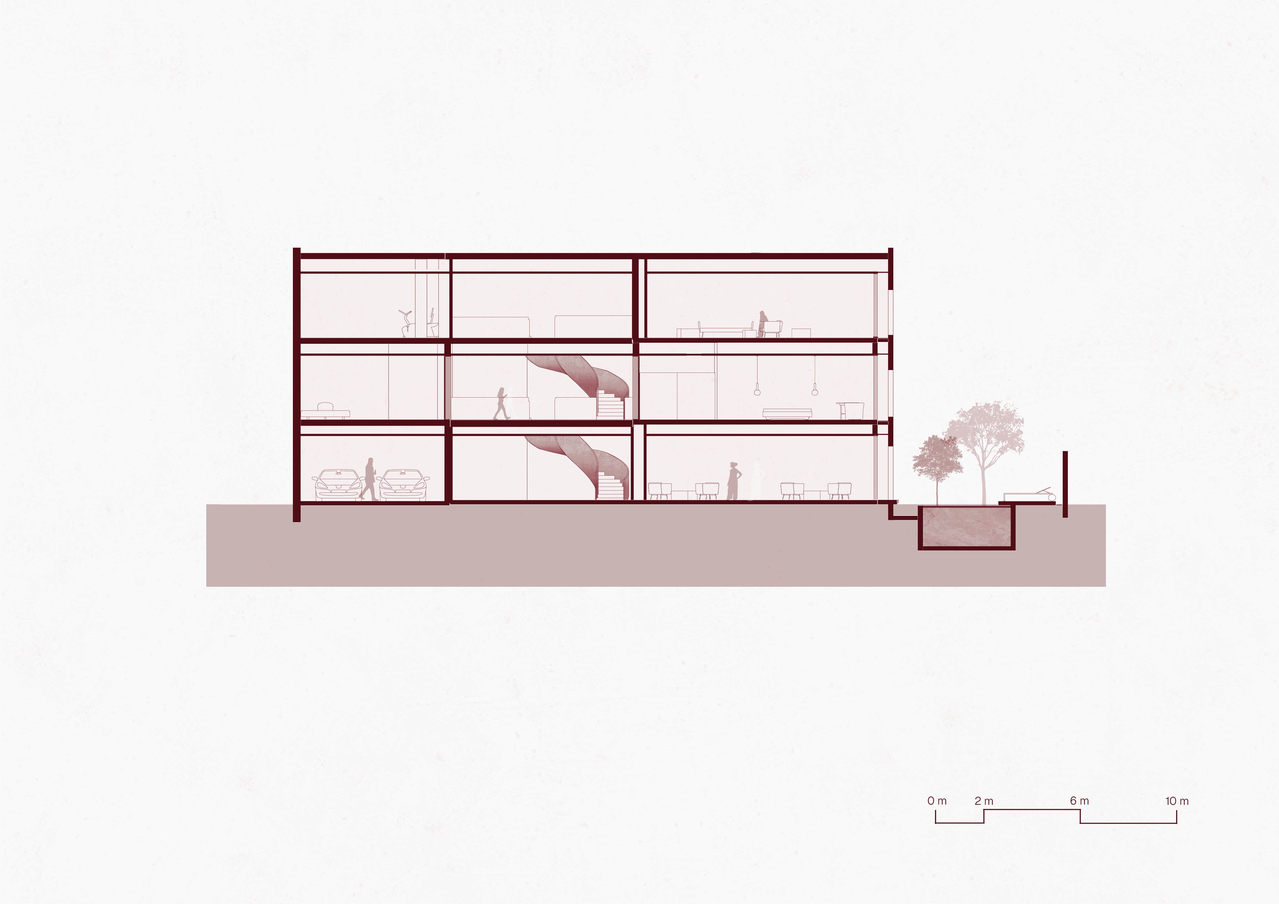 Beneath the arched envelope lies a completely interior structure. The sectional cut highlights the vertical integration of the villa, anchored by a central spiral staircase that pierces through the building's core. Beyond simple circulation, this sculptural void functions as a vital light well, drawing natural illumination from the roof and channeling it deep into the heart of the lower levels.