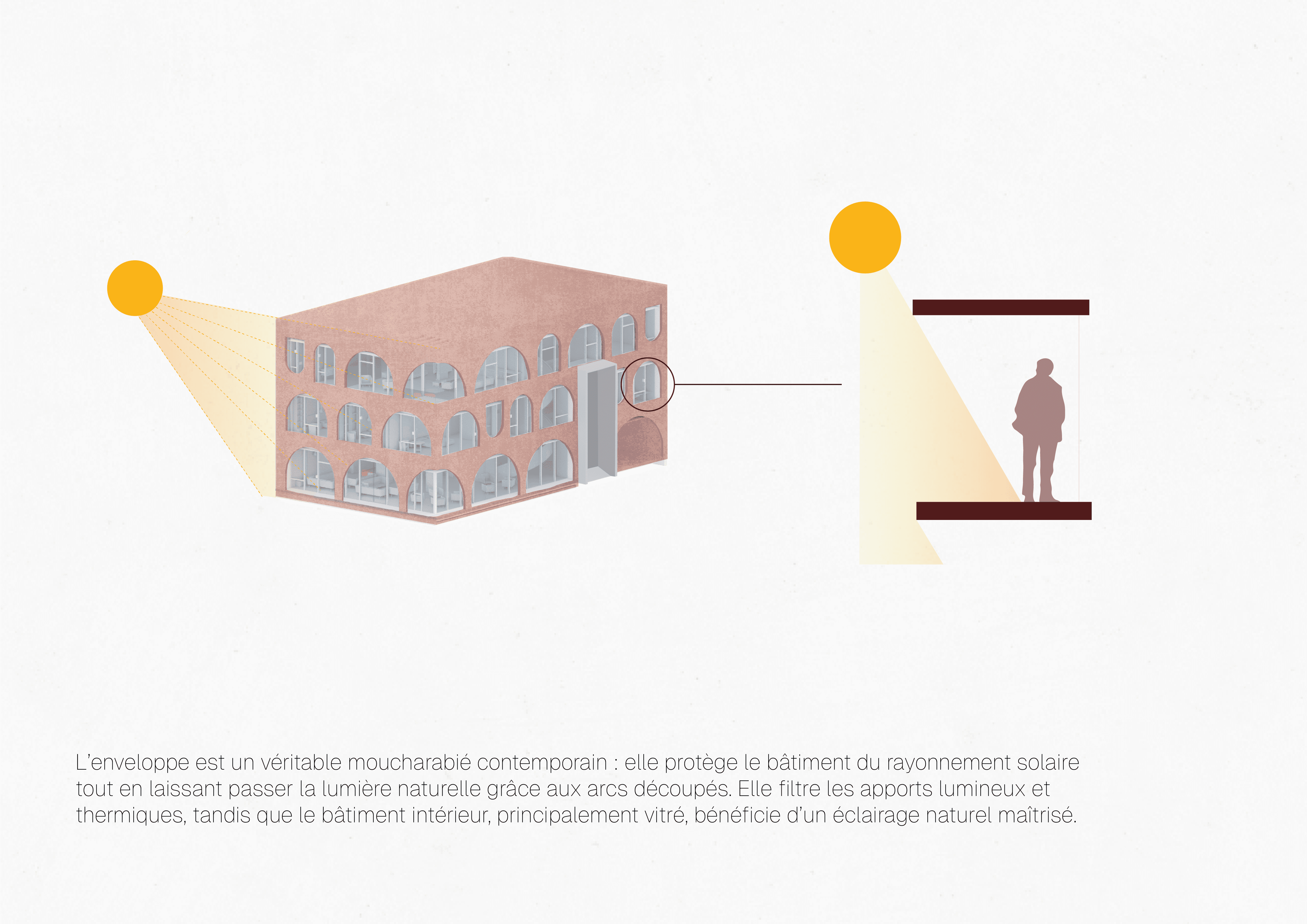 The building's envelope is a veritable contemporary mashrabiya: it protects the building from solar radiation while allowing natural light to filter through its cut-out arches. It filters light and heat gain, while the interior, primarily glazed, benefits from controlled natural lighting.