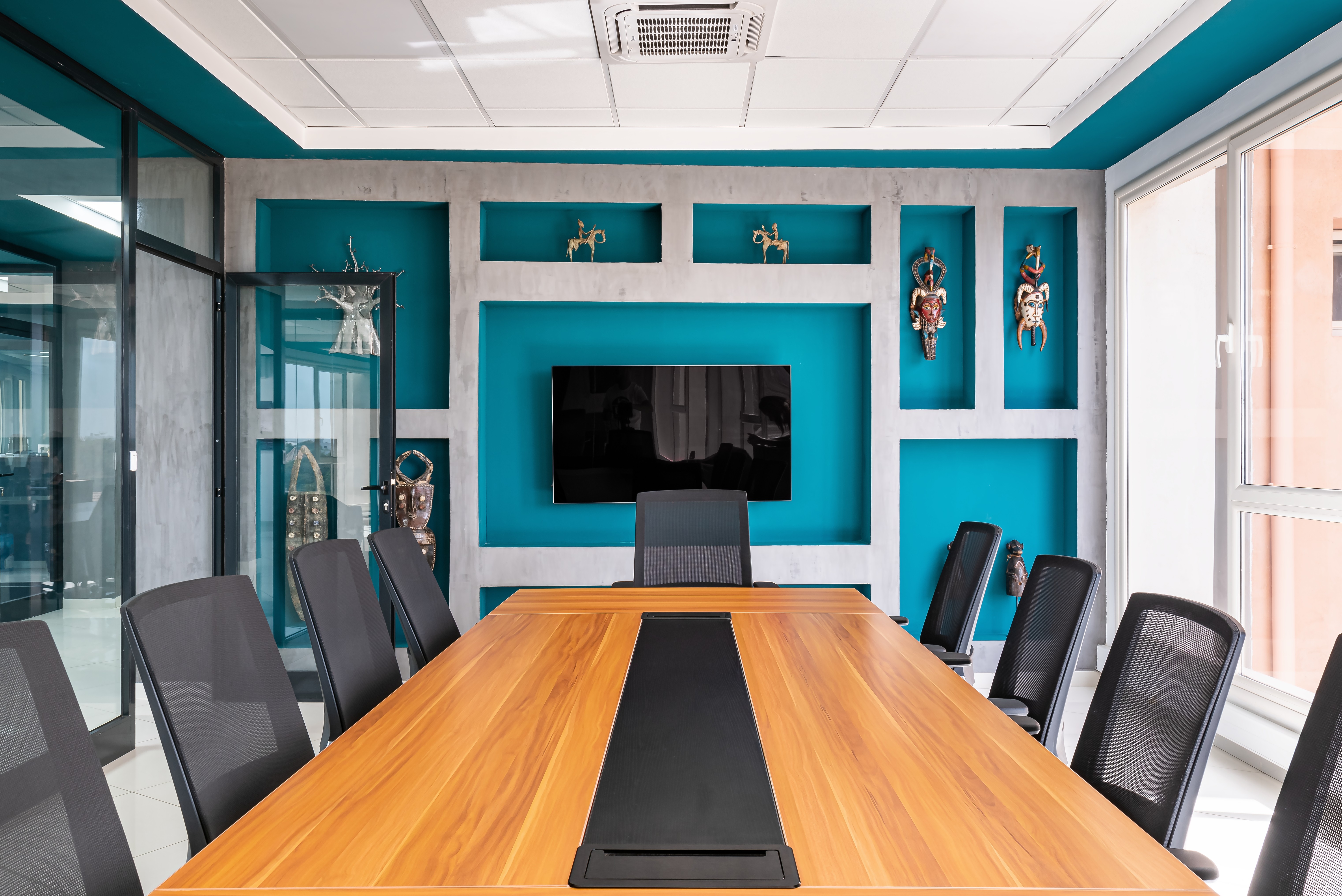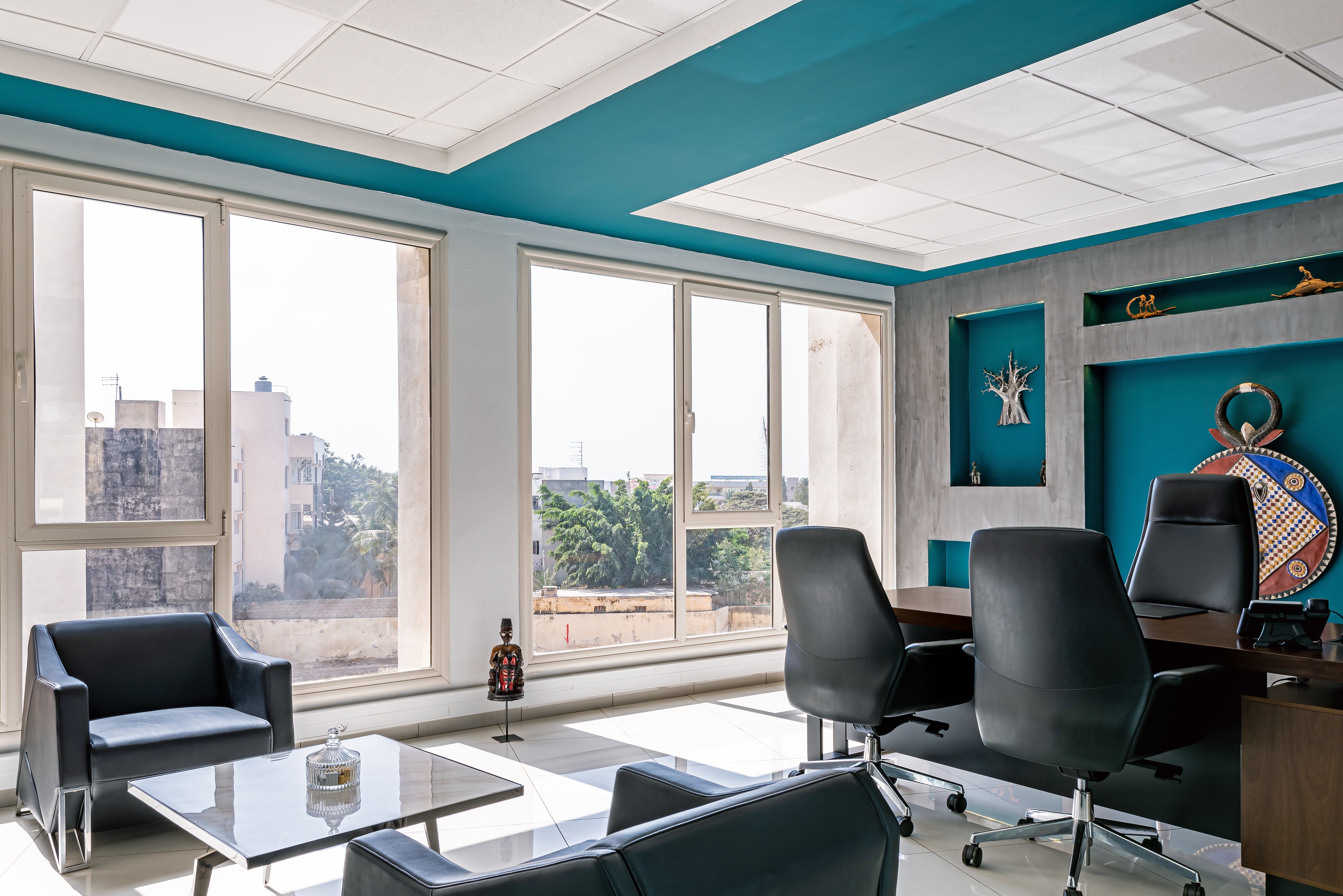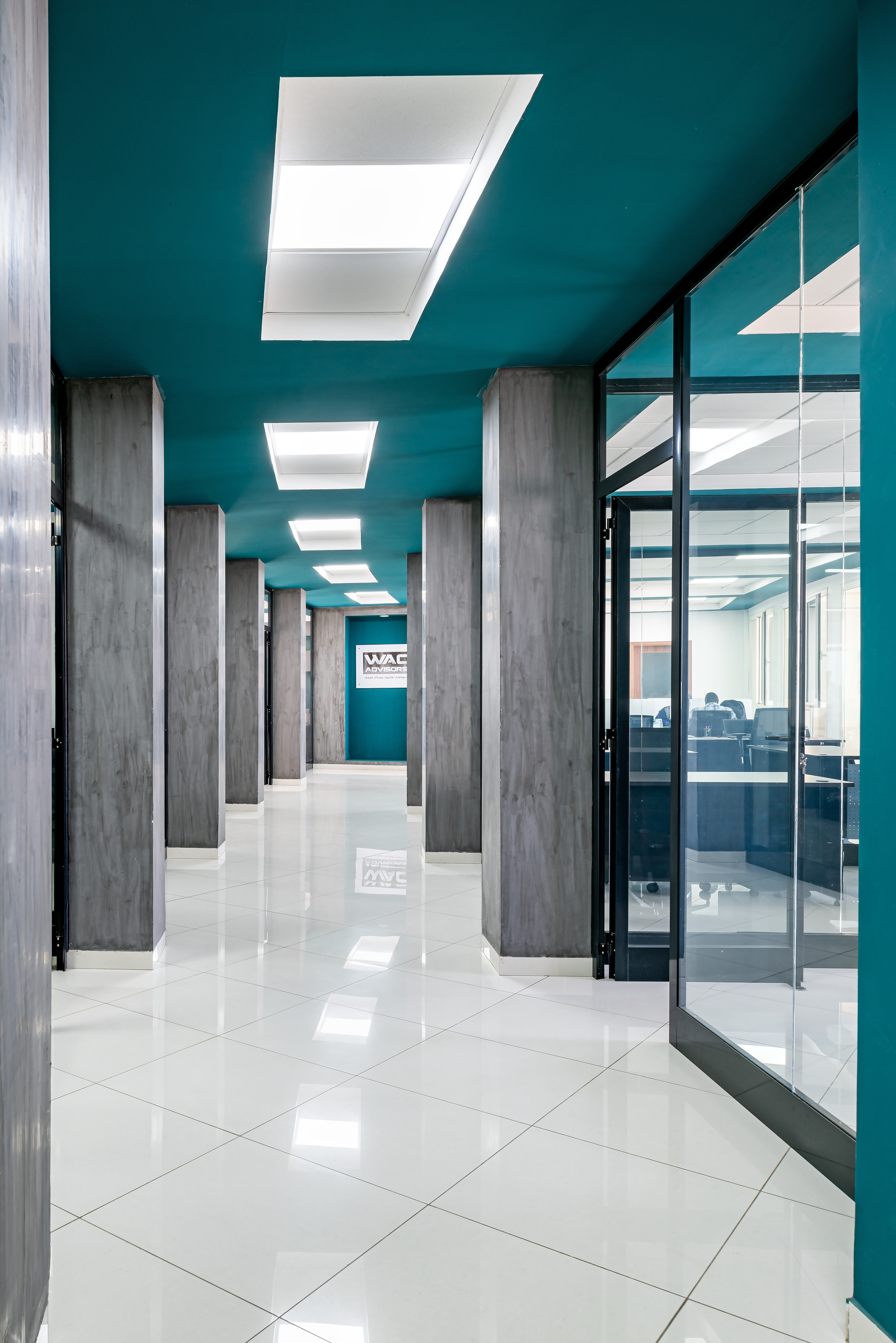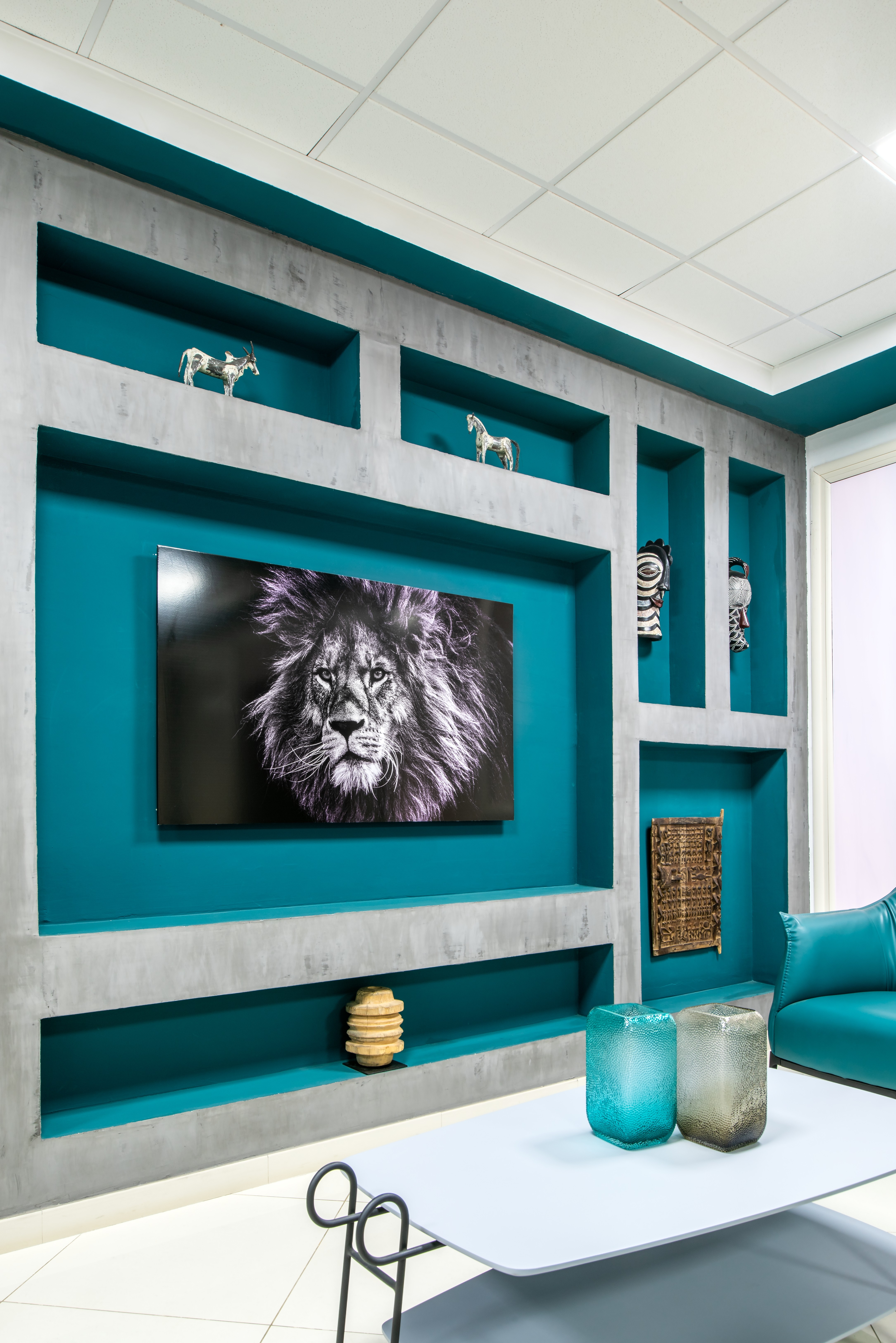 The oil-green color of the logo finds its ideal placement on the ceiling, dominating the space and unifying the different workspaces. The wenge and dark grey wood furniture maintains the level of privacy and decorum required by the office, while the niches carved into the wall allow for the display of artwork.